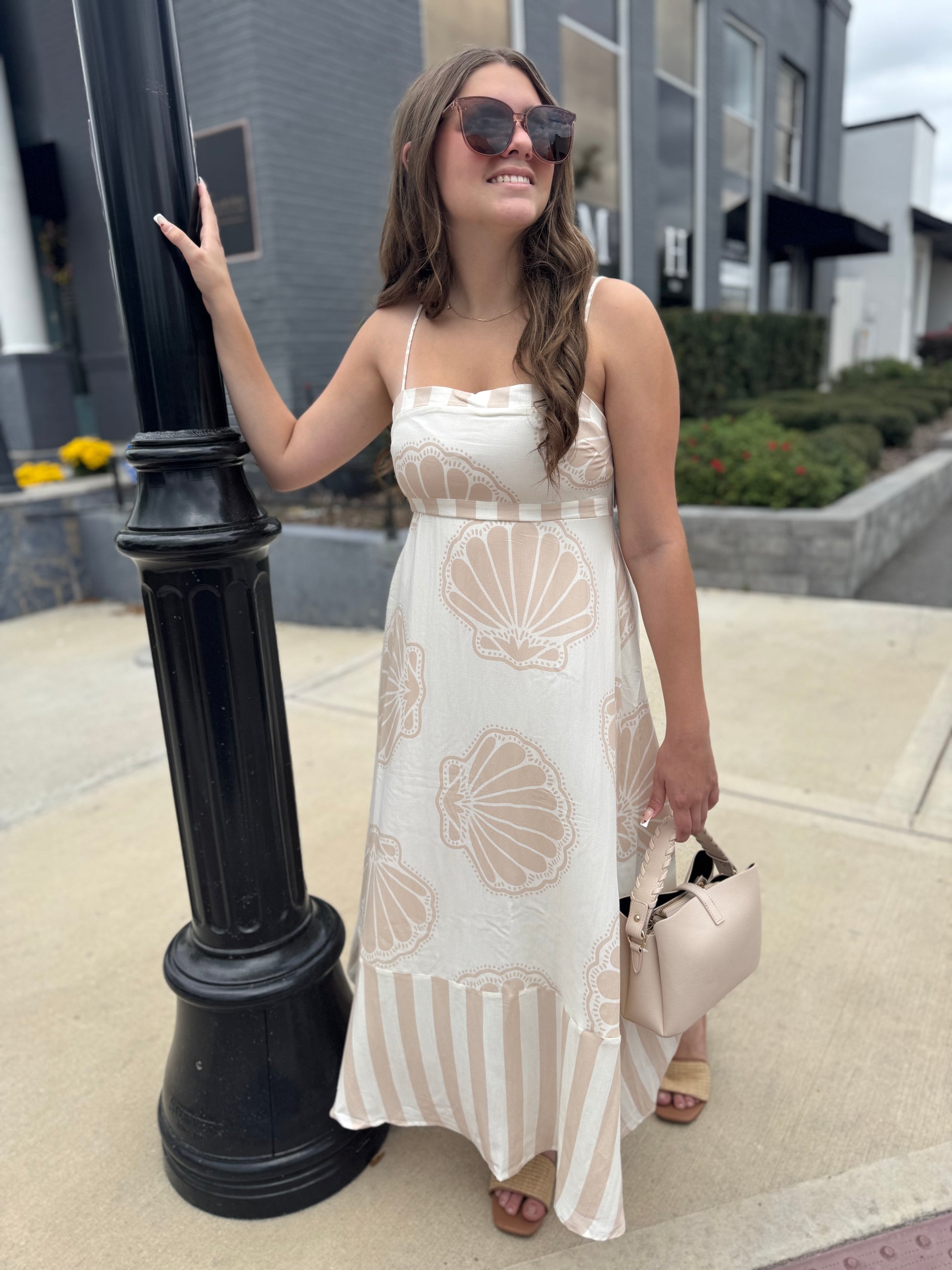 Soft, breezy, and effortlessly beautiful. This neutral spaghetti strap maxi dress features a flattering empire waist and a delicate shell design throughout that gives it the sweetest coastal vibe. Lightweight and flowy, it’s perfect for beach vacations, sunset dinners, or any day you want to feel a little extra dreamy. Just add sandals and you’re ready for wherever the day takes you.