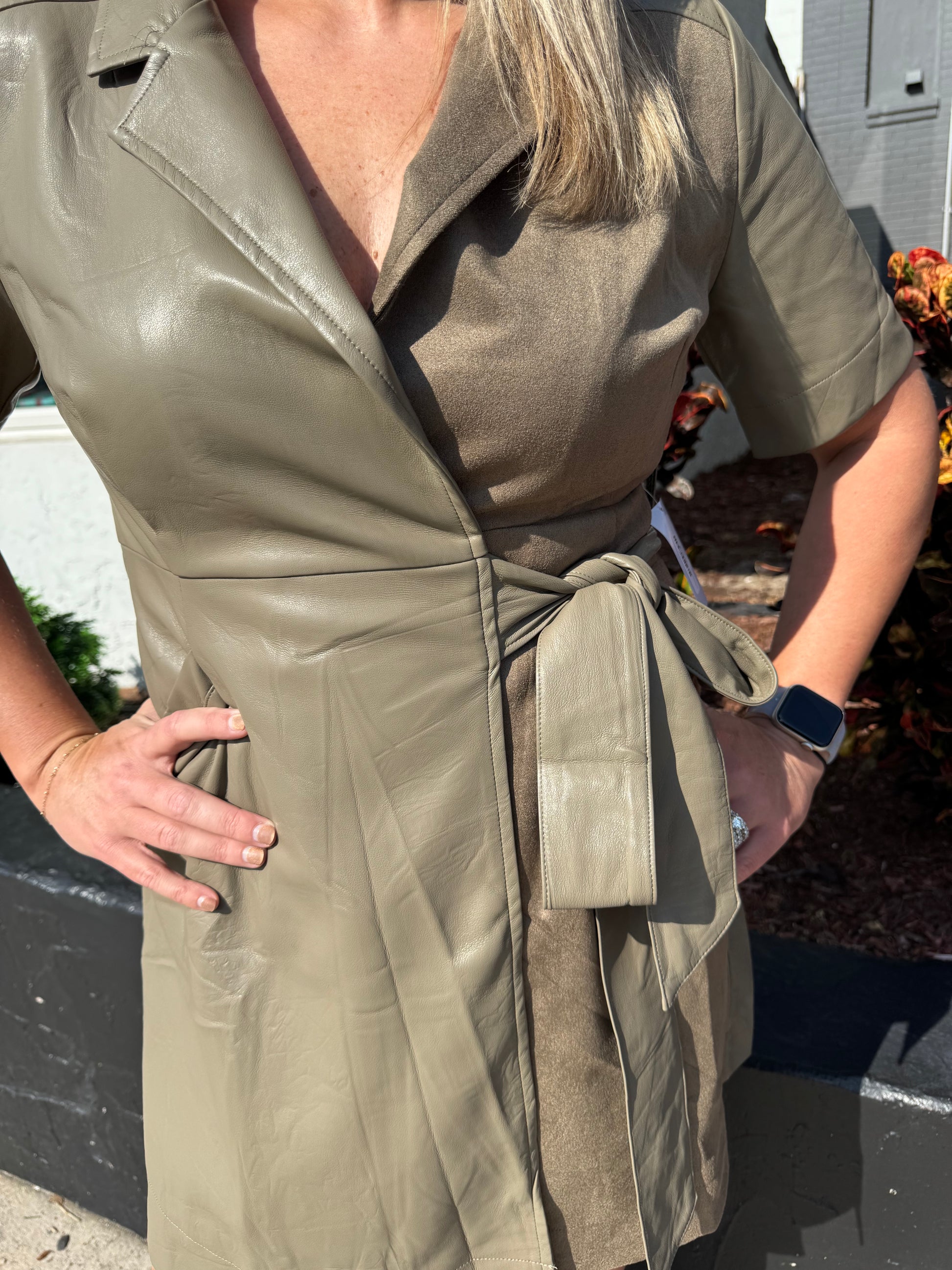 Turn up the heat in a cool winter hue with the Frosted Flair Faux Leather Wrap Dress. This flirty faux leather mini wraps you in all the right places, giving you that effortless “wow” moment the second you walk in. With a luxe winter color and a playful silhouette, it’s the go-to dress for date nights, girls’ nights, and every “I need to look amazing” moment. Pair it with heels or boots and prepare for compliments—lots of them.