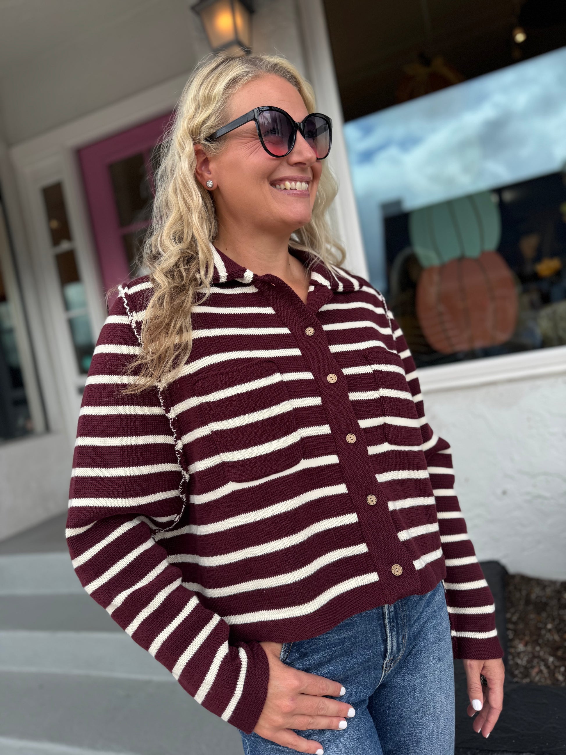 Say hello to your new fall favorite—the Harvest Stripes Knit Top! With its playful collar, button-down front, and stripes in all the hues of the season, this cozy knit is equal parts chic and fun. Dress it up with denim and boots for pumpkin patch perfection, or keep it casual for those crisp autumn mornings. It’s the kind of top that makes fall layering feel effortless and stylish.