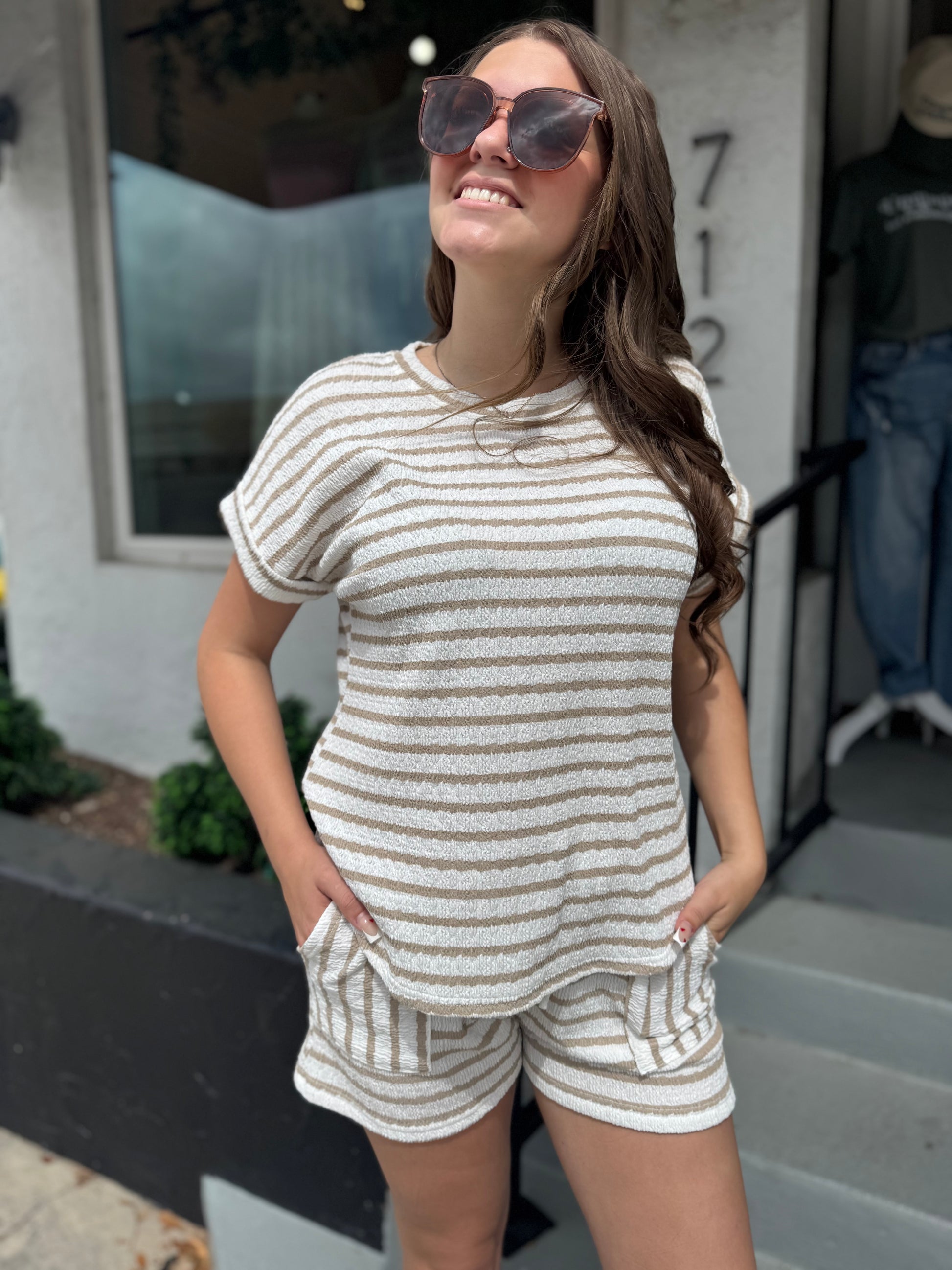 Relaxed days just got a little cuter. This fun and lightweight striped top and bottom lounge set is made for breezy beach days, slow mornings, and all those well-deserved days off. With its comfy fit and easygoing style, it’s the perfect throw-on-and-go set for feeling cozy while still looking effortlessly put together. Just add sandals or go barefoot in the sand and enjoy the day.