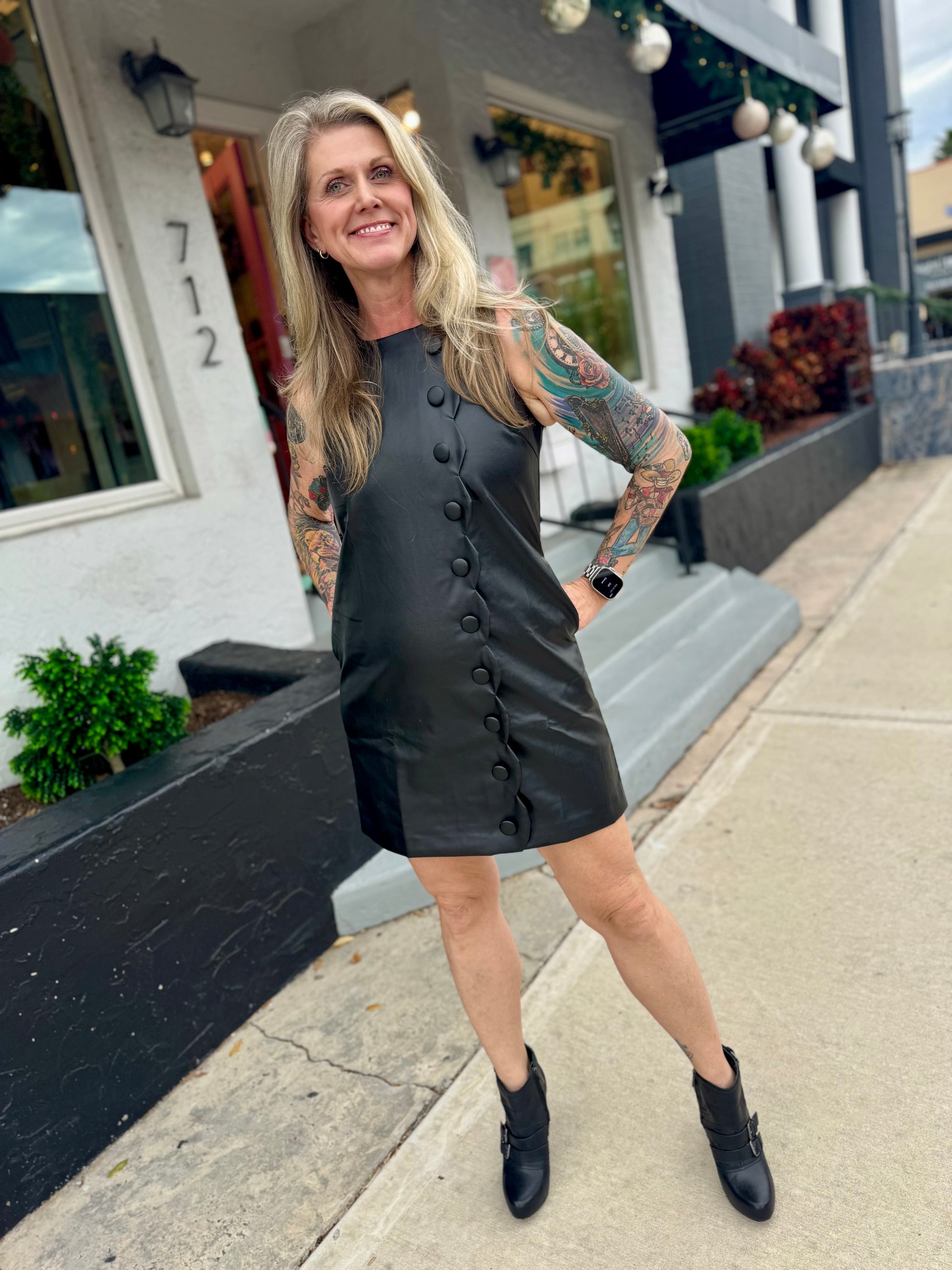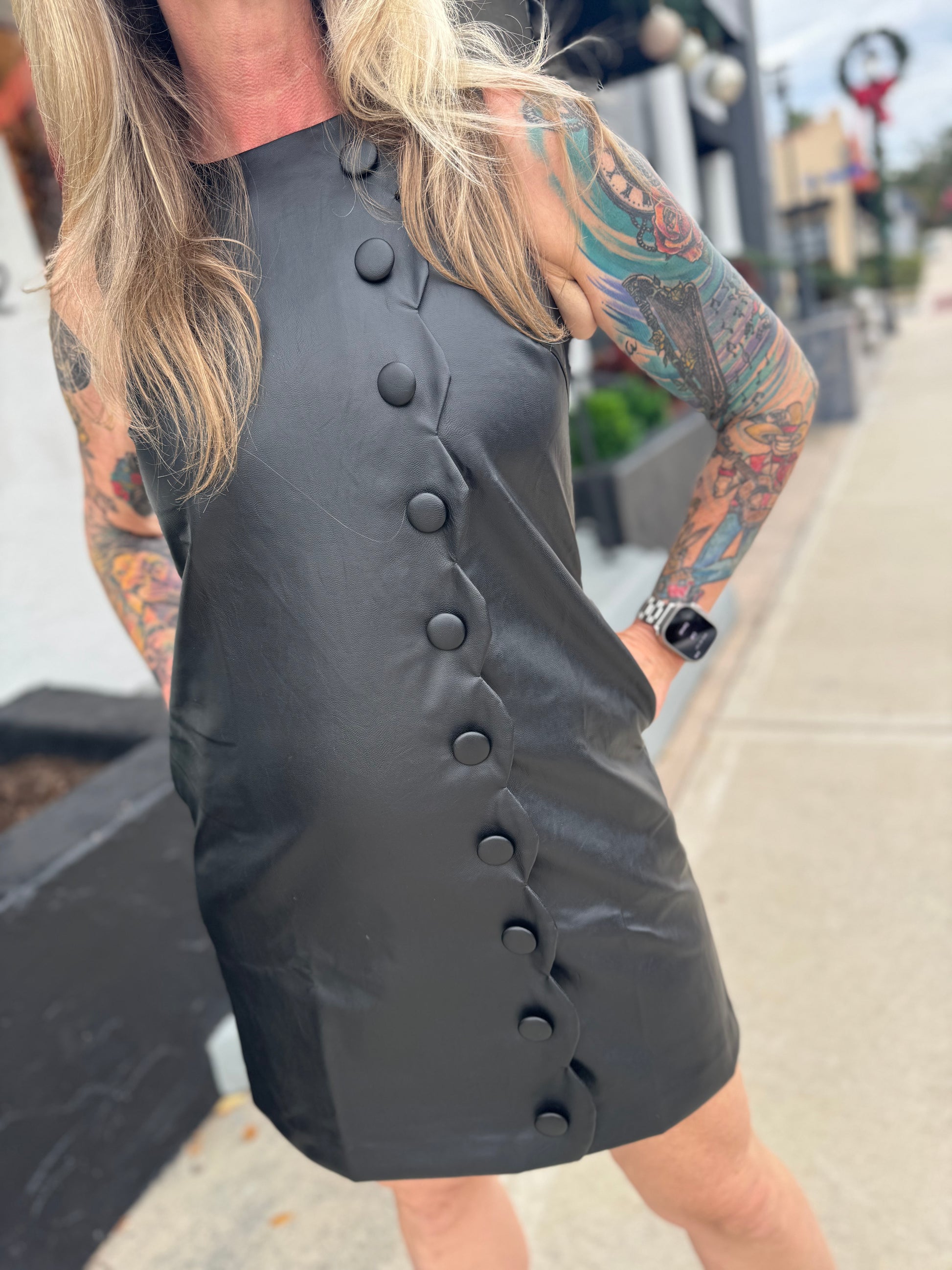 It’s giving flirty, it’s giving fun, it’s giving add to cart. With its darling button details and whimsical scallop hem, this faux leather mini is made for feeling fabulous. Style it up, keep it casual—either way, she’s a show-stopper.